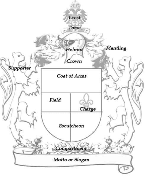 Coats of arms can contain many different symbols within their elaborate design, such as a shield, crest, helmet, weapons, or even a saying representing the family motto.