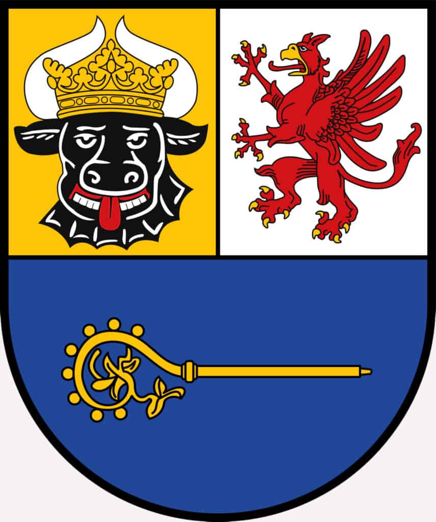 Dargun, a town in the Mecklenburgische Seenplatte district, in Mecklenburg-Western Pomerania, Germany, is the birthplace of many of my ancestors.  Within the exterior walls of Dargun Castle has existed a coat of arms.  It wasn’t until November 9, 1875, that the arms were officially granted to the town.  The crozier (hooked staff carried by a bishop) alludes to the Cistercians, whose monastery of Röcknitz, first mentioned in 1178, was the settlement core of the city established later on.  The mythical creature griffin of Pomerania is a reminder that the city once belonged to Pomerania from 1236 to 1291.  Finally the bull’s head symbolizes that the city has belonged to Mecklenburg-Schwerin since 1815.