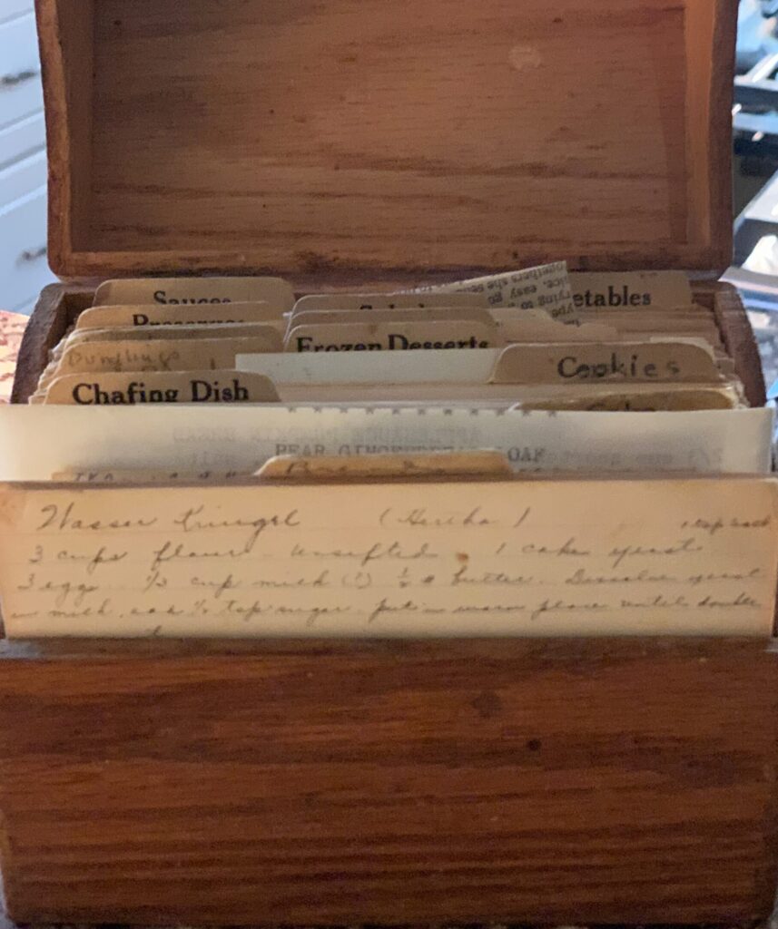 Years ago, my older cousin gave me our grandmother’s (Oma) recipe box.  It’s nothing fancy, just a plain wooden box.  It’s contents are primarily recipes either from family or friends and maybe one or two that were from my Oma.  From what I can gather, there must have been a movement back in the 1960’s amongst the women within my Oma’s circle of family & friends. The movement appears to share a favorite recipe or technique for serving up delicious eats.  And I say this because several of the cards are dated to that decade.